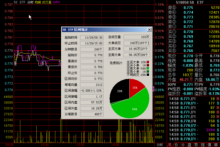 在分时图界面,可用右键选中一段区间进行分笔统计,或者按Ctrl+W进行本屏的所有分笔统计(如果使用多日分时图,对这些天的分时也